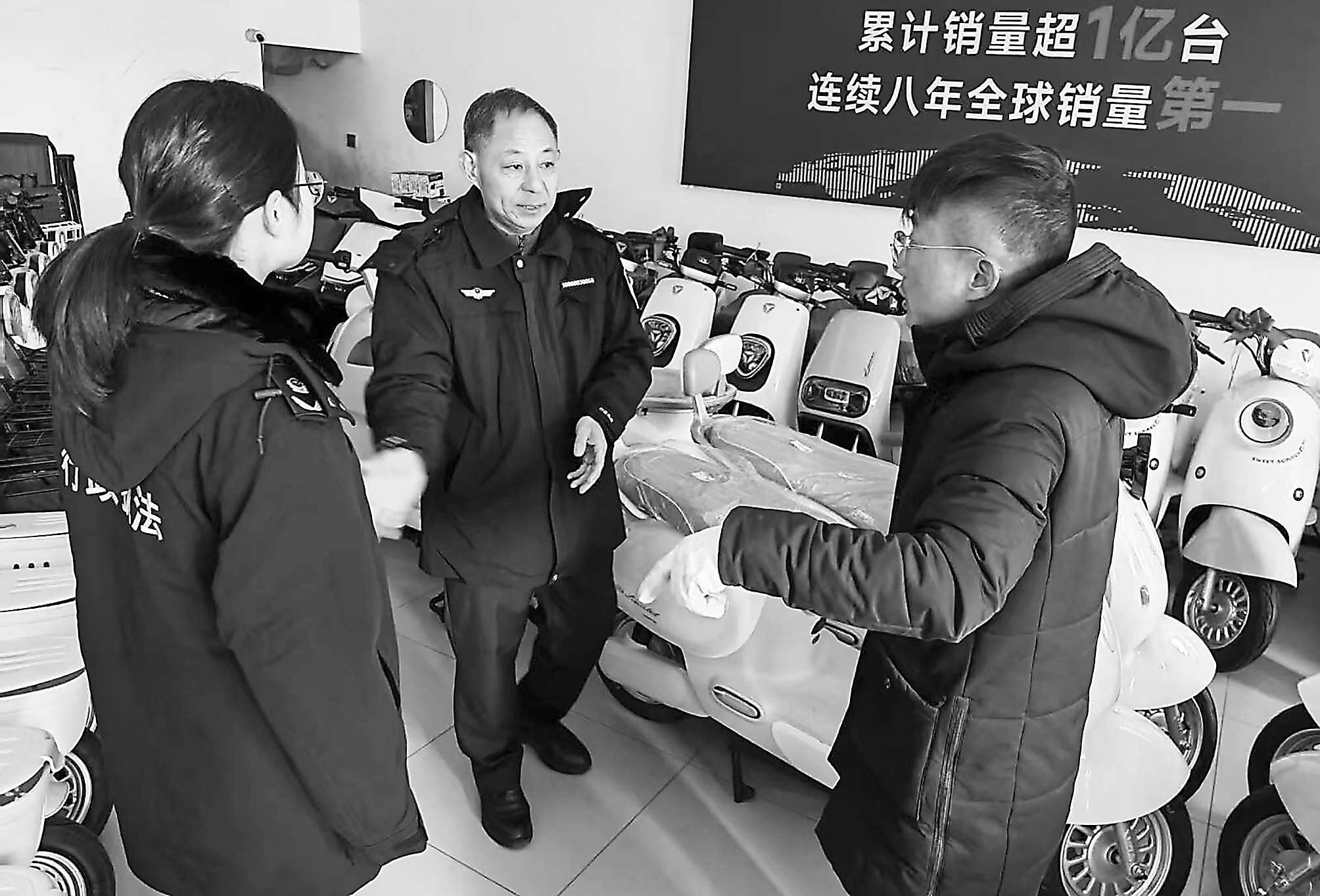◀2月6日,为保障春节市场安全稳定,江苏省淮安市市场监管局以“四不两直”方式开展节前综合督查。执法人员深入电动自行车经营场所,严查车辆质量及销售合规情况,保障群众安心过年。 □刘广波 王加波/摄影报道