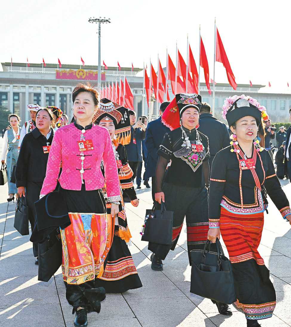 3月9日,十四届全国人大四次会议在北京人民大会堂举行第二次全体会议。 左图:全国人大代表走向会场。 □新华社记者 陈益宸/摄