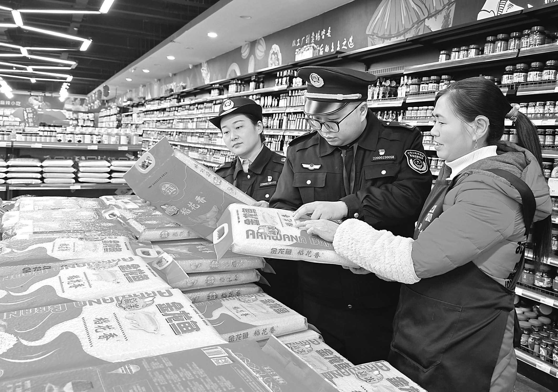 连日来,重庆市涪陵区市场监管局集中开展大米质量专项检查,重点检查辖区大米生产企业是否按照自我声明公开的质量标准进行生产加工,是否履行出厂检验义务,检查销售企业的进货来源、产品合格证明,看是否存在假冒他人注册商标,是否销售过期变质大米等行为。图为执法人员在一家超市检查大米包装上的商标标识情况。 □文光辉 李 巧/摄影报道