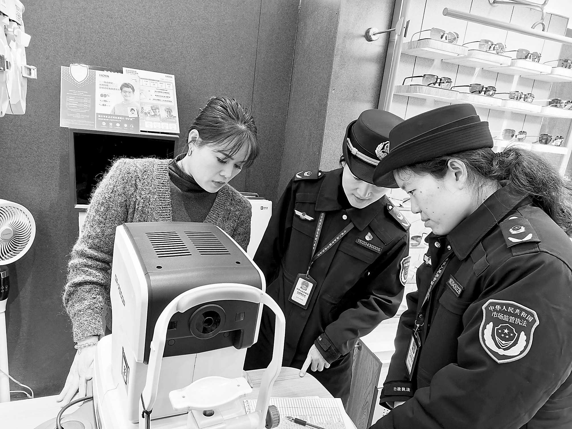 为切实保护青少年视力健康,规范眼镜制配市场秩序,浙江省宁波市北仑区市场监管局日前部署开展眼镜店计量监督检查,重点对眼镜店在用的焦度计、验光仪、角膜曲率计等强制检定计量器具进行全面“体检”,确保验光数据精准、配镜质量可靠,筑牢计量安全防线,为广大学生的清晰“视”界保驾护航。 □丁苗娟/摄