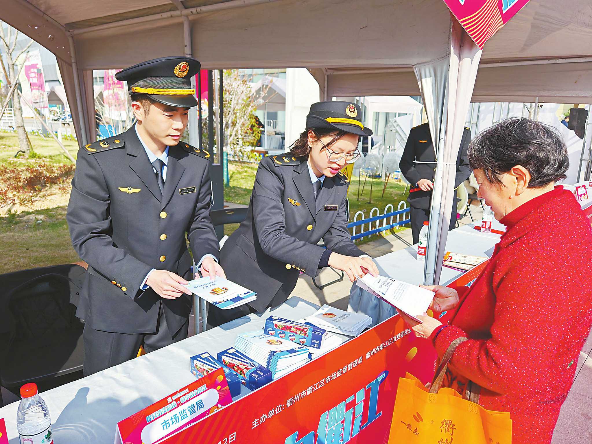 浙江省衢州市衢江区市场监管局近日开展“提升消费品质 畅享活力衢江”放心消费嘉年华暨3·15国际消费者权益日宣传活动。该局在活动现场设置宣传咨询服务台,为市民提供消费纠纷受理、商品真伪鉴别、食品安全快检、计量校验等服务。图为工作人员向市民讲解消费维权知识。 □江超凡 周阳荣/摄影报道
