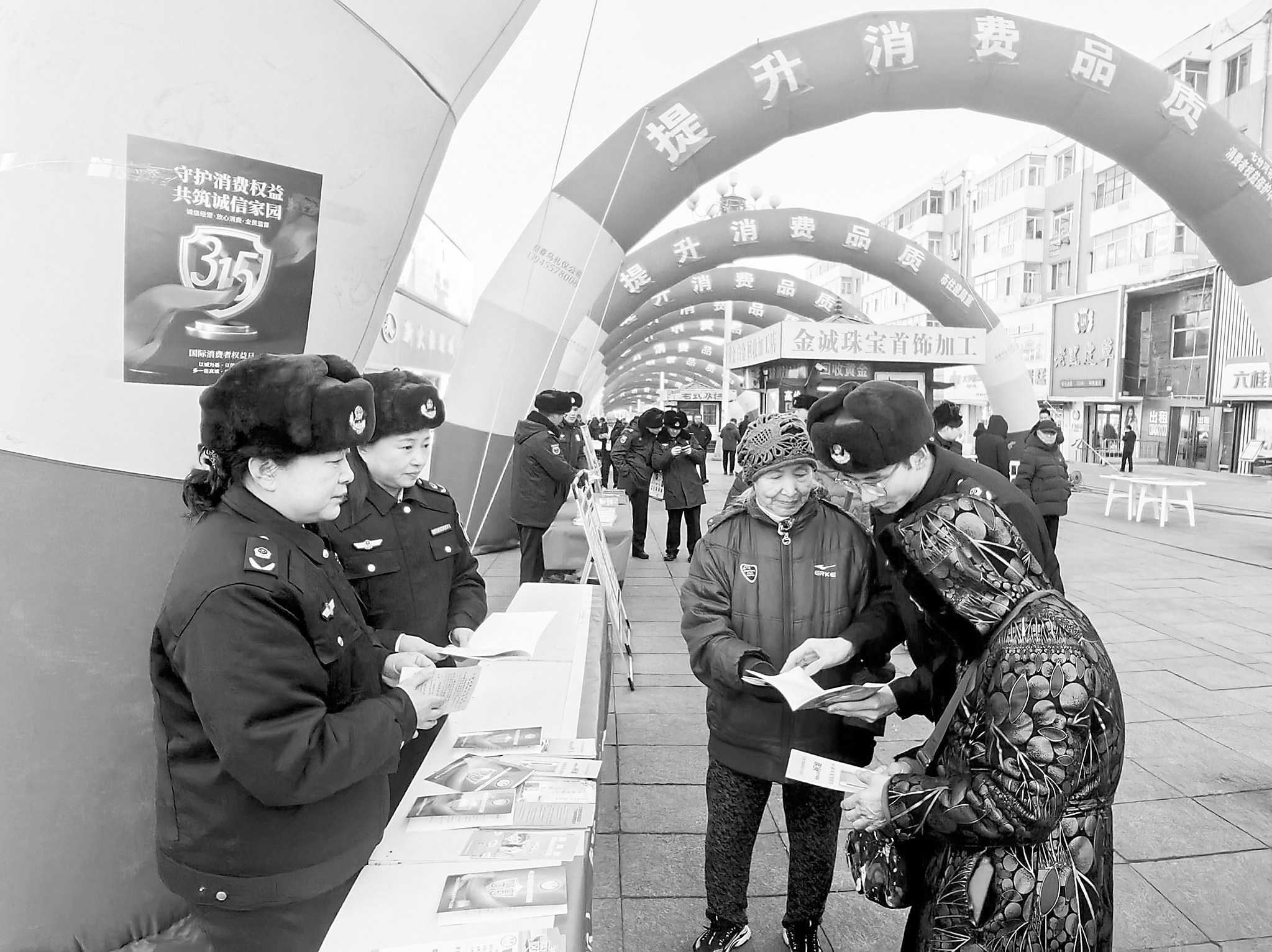 黑龙江省七台河市市场监管局、市消费者权益保护中心在3·15国际消费者权益日当天,组织消费者权益保护中心成员单位及商家开展消费维权宣传咨询服务活动。图为该局工作人员向过往市民发放宣传资料,讲解维权知识。 □岳 权/摄