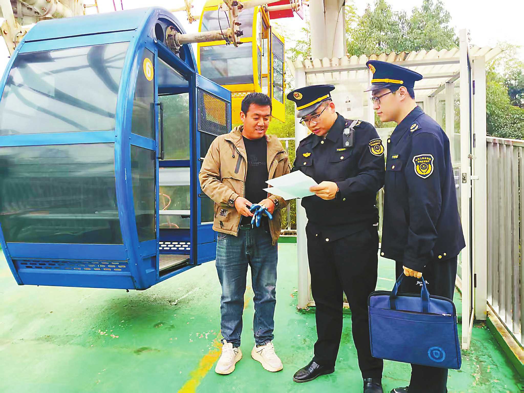 连日来,浙江省武义县市场监管局聚焦春季旅游热点,开展辖区景区特种设备安全检查,守牢人民群众安全底线。图为该局执法人员在一处旅游景区对游乐设备进行检查。 □徐鸿润/摄