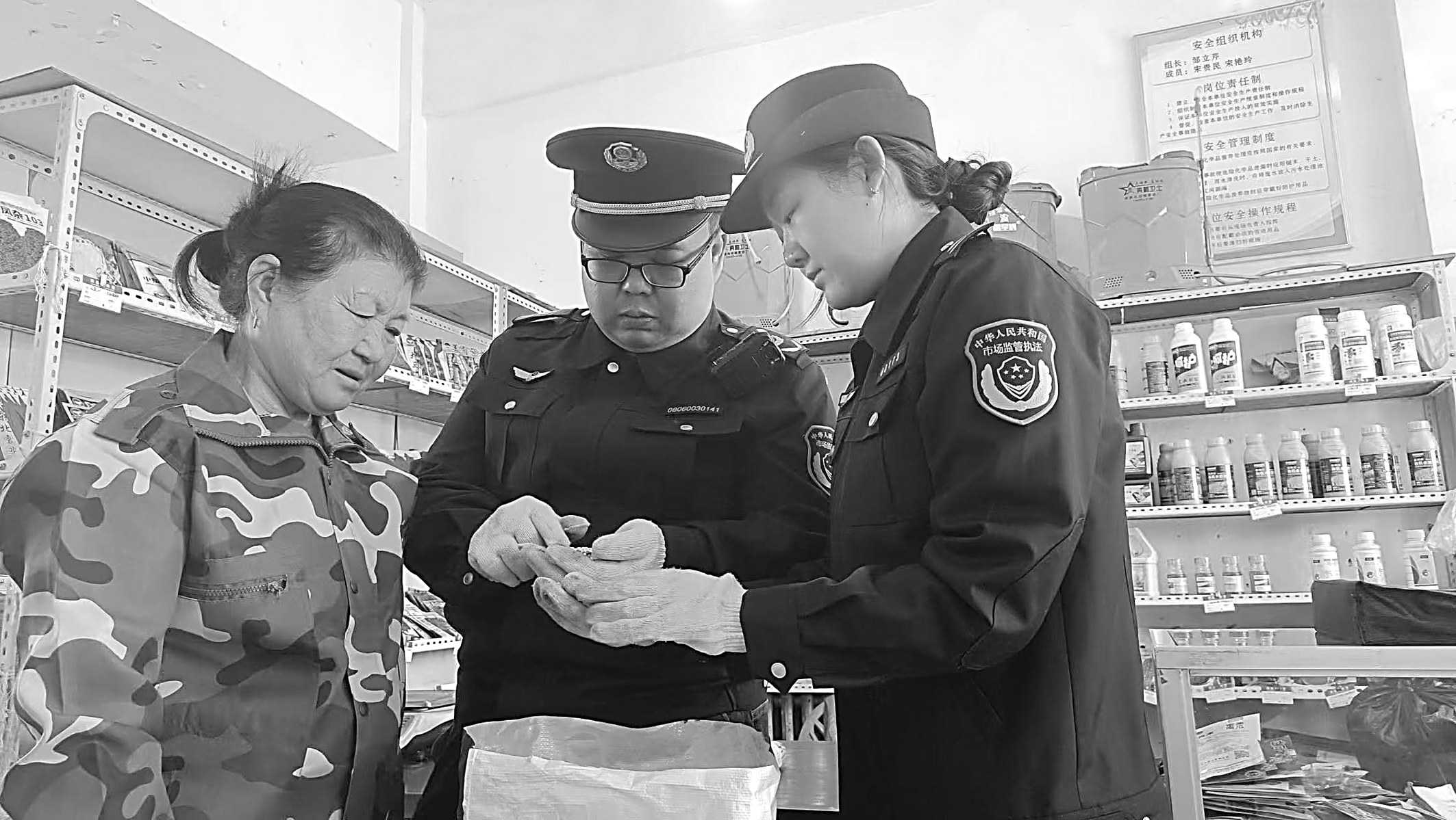 当前正值春耕生产时节,图为3月18日,黑龙江省鸡西市市场监管局执法人员深入滴道区农资商店检查农机用品、农用化肥,向农资经营者宣讲工业产品生产许可证管理、农资产品标签、商标相关规定,助力农业增效、农民增收。 □果文莹/摄