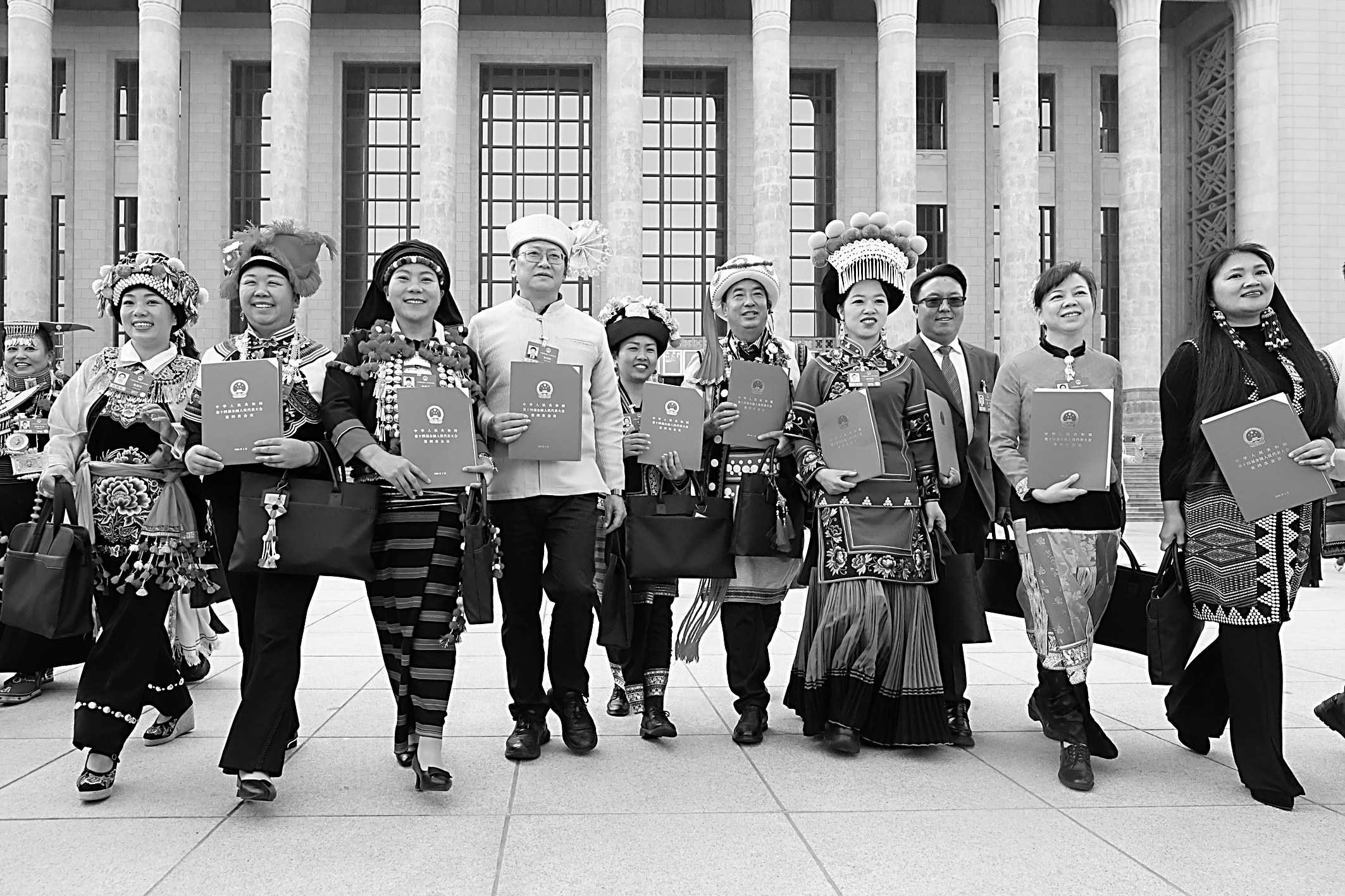 3月12日,十四届全国人大四次会议闭幕后,全国人大代表们在大会堂前合影。 □宿志红/摄