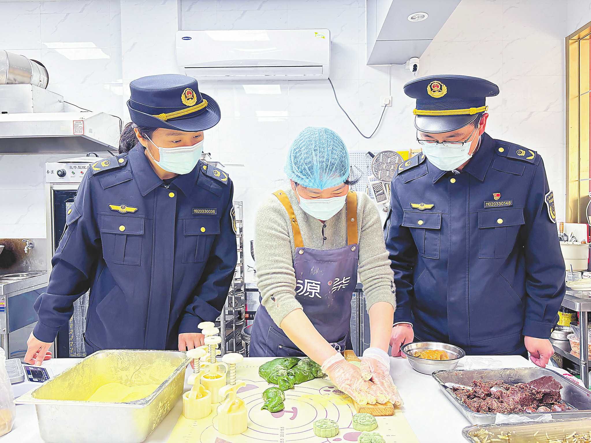 连日来,浙江省宁波市镇海区市场监管局深入食品加工小作坊,全方位检查青团等清明节令食品安全,进一步规范食品加工操作流程。图为该局执法人员在一家店铺检查青团制作安全情况。 □刘 学翁戎艳/摄影报道