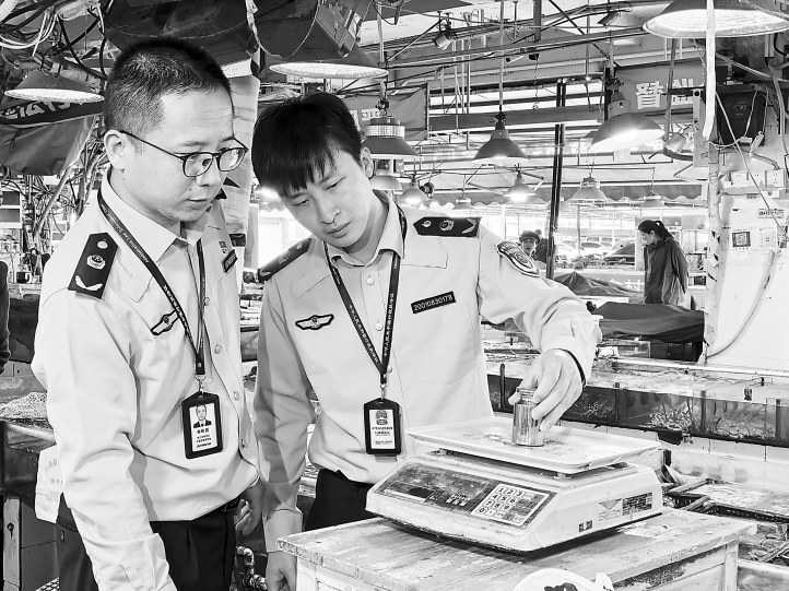 在厢竹海鲜市场,执法人员拿出1千克标准砝码,对海鲜摊位的电子计价秤进行现场测试,重点检查计量器具是否在检定有效期内、铅封签封是否完好、称量数值是否精准,同时向经营者宣传计量法律法规,引导商户依法申请强制检定、规范使用计量器具、诚信守法经营。