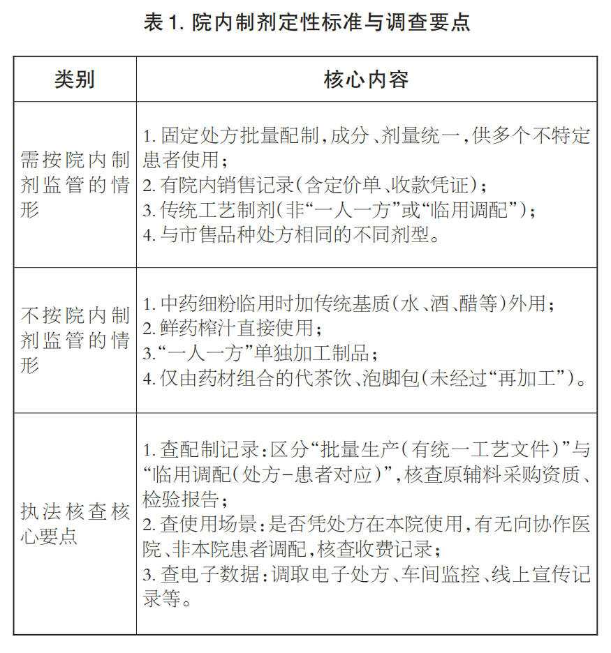 针对前述违法行为认定、调查取证等关键问题,笔者对相关要点进行梳理总结(参见表1),以进一步明确定性标准与核查要点,为基层执法提供参考。判断是否为院内制剂,以是否取得医疗机构制剂许可证为前提,结合制剂配制方式、使用场景、处方特性,对照《关于印发加强医疗机构中药制剂管理意见的通知》(国中医药医政发〔2010〕39号)中明确的“不纳入院内制剂管理范围”,重点区分“批量配制”与“临用调配/一人一方”两类情形。
